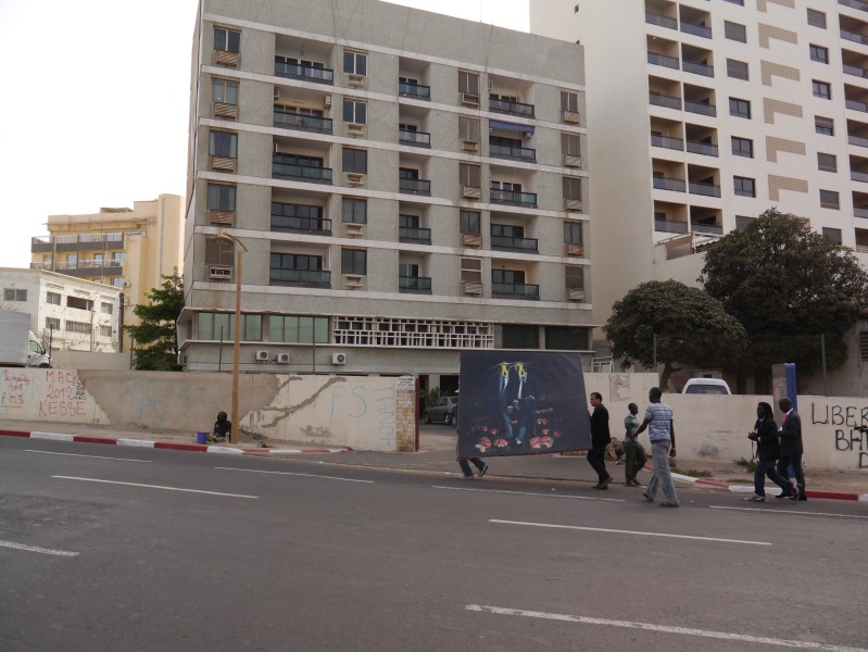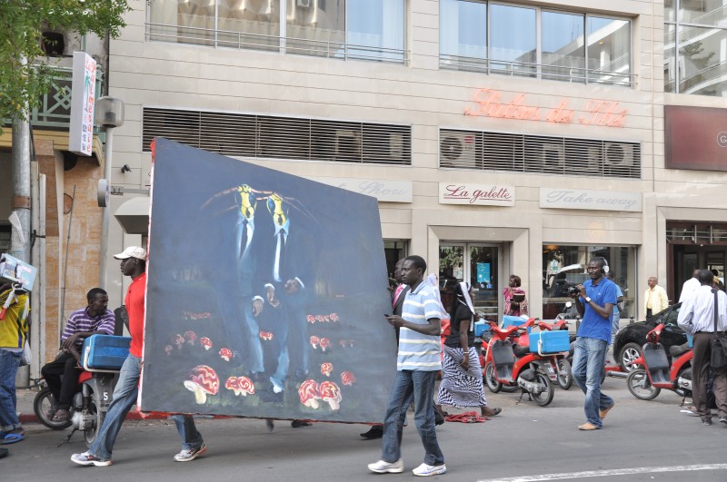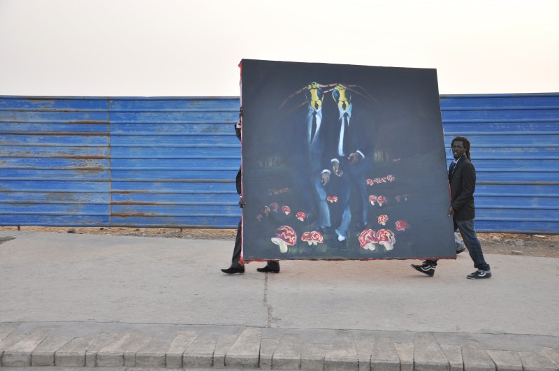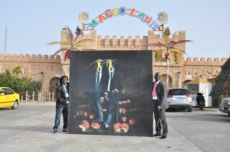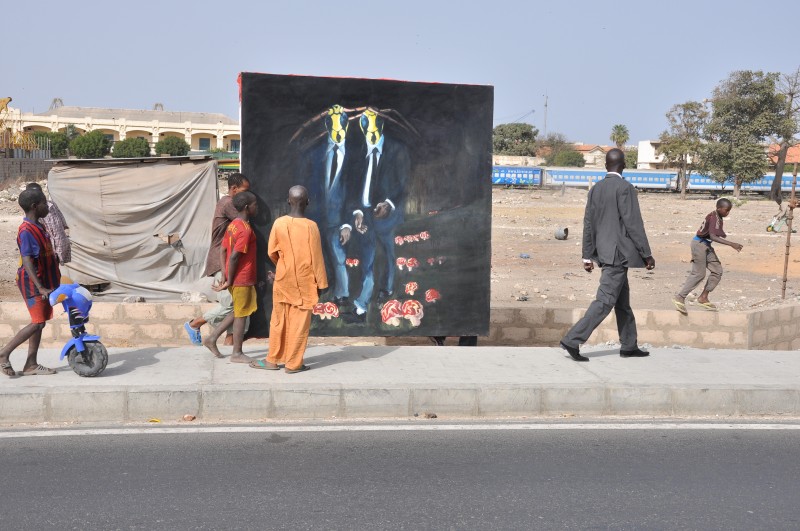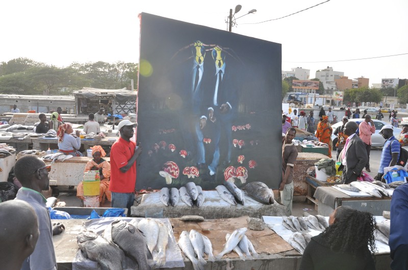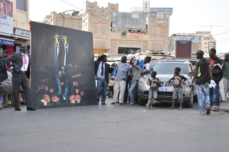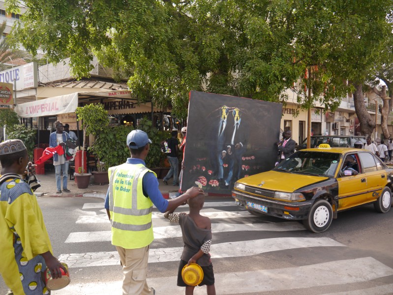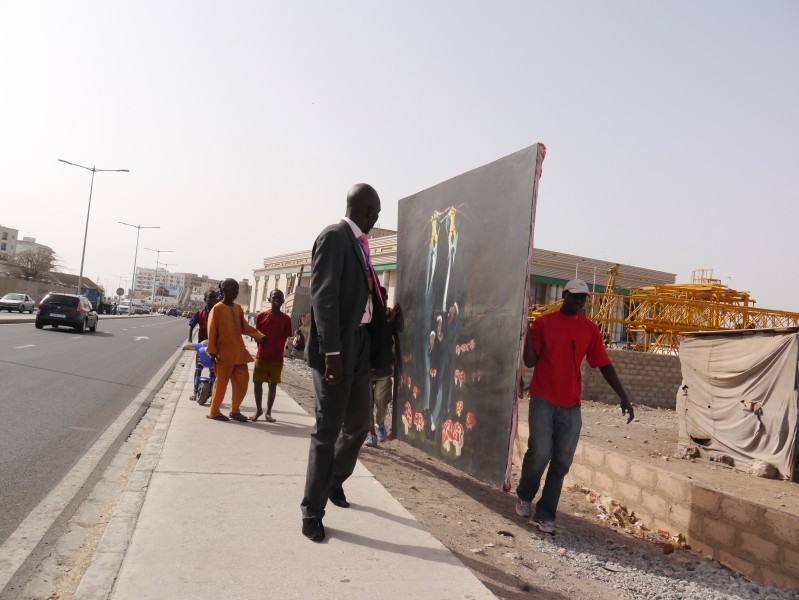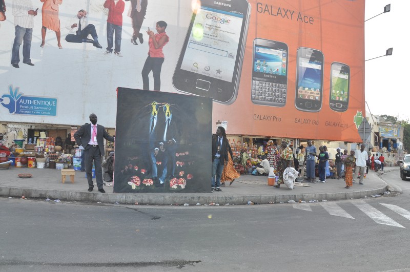 La pièce « Twin Freaks », une grande toile d’1m90 réalisée à Dakar, a été sortie par les agents et moi même pour explorer les coins improbables de la ville. De la Cathédrale au Magic Land, du Ministère des Finances au marché de Soumbédioune. Escortée par les agents d’accueil du Musée des Biens Communs, « Twin Freaks » propose un regard critique et ironique sur la fonction de médiation dans la création artistique contemporaine. Mais la promenade de la toile n’est pas encore arrivée à destination, elle sera offerte à la fin de l’exposition à un lieu public. Affaire à suivre…