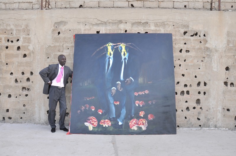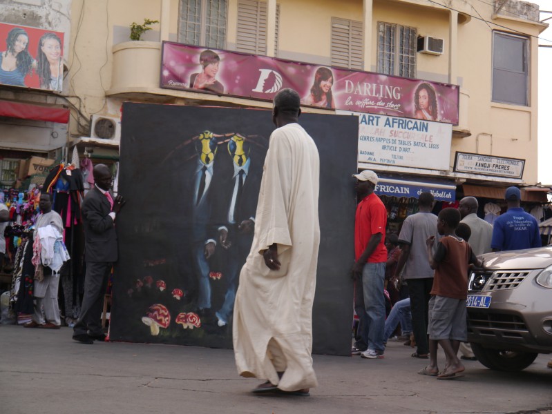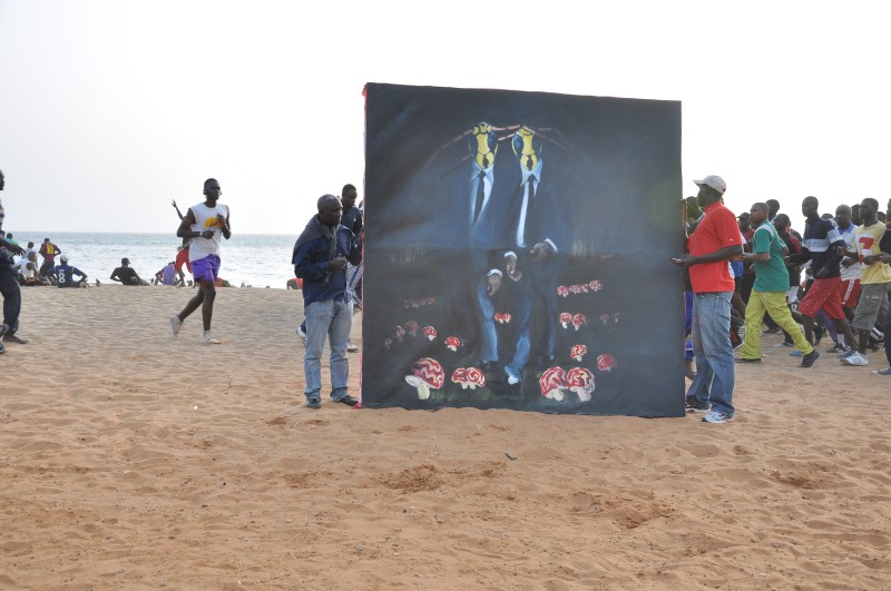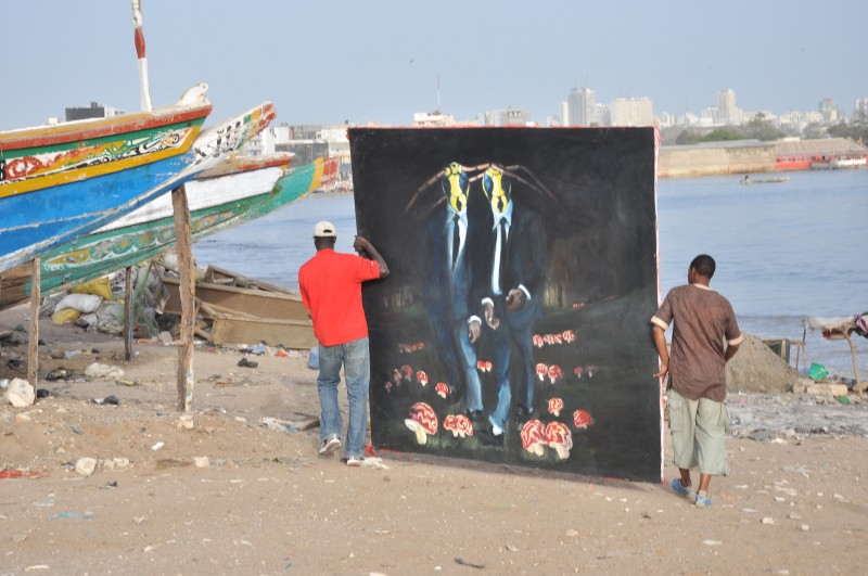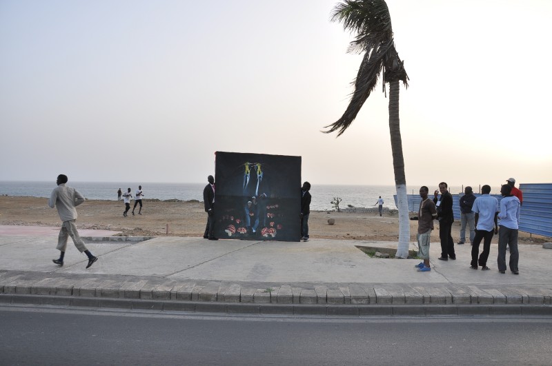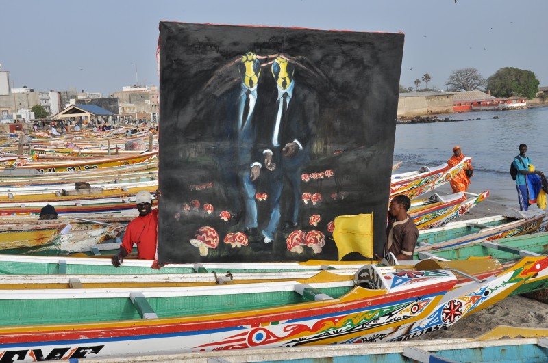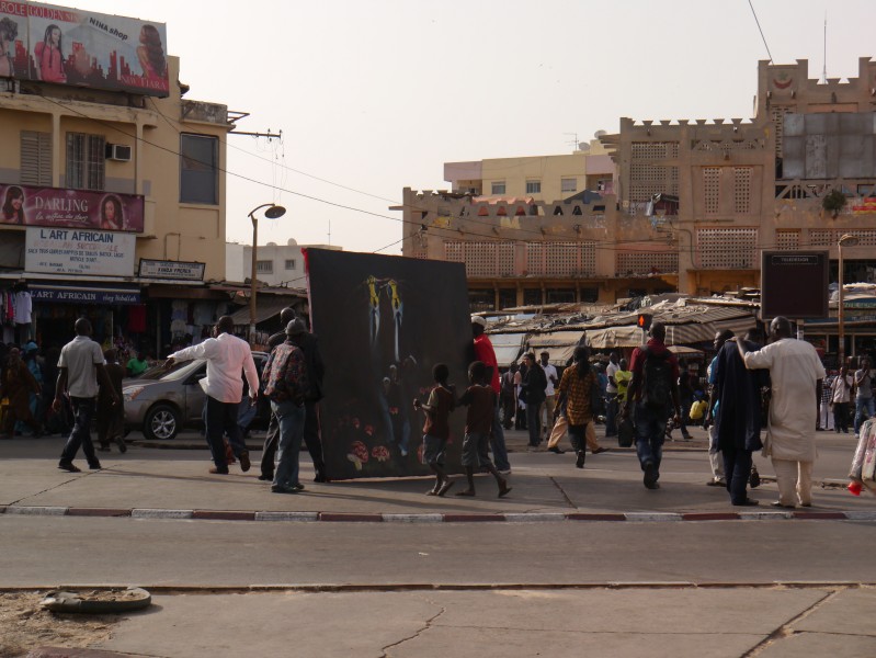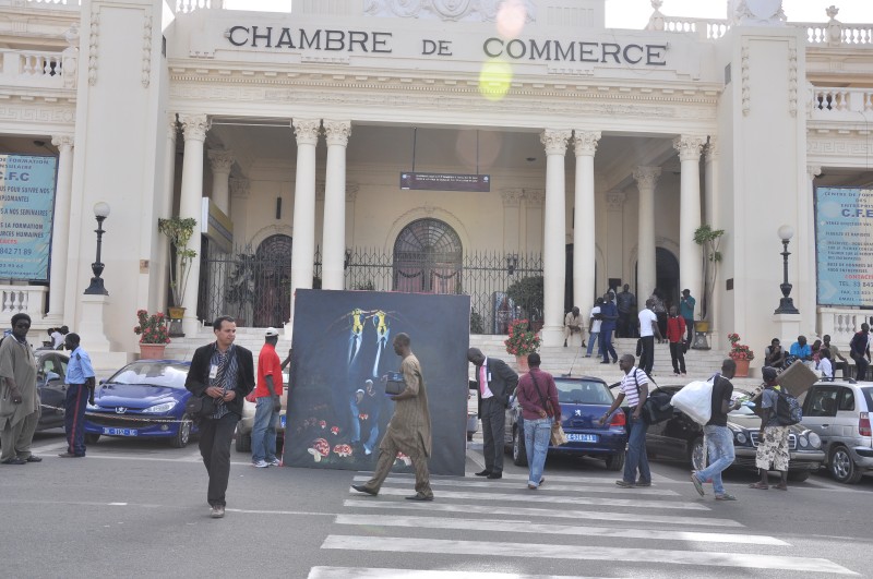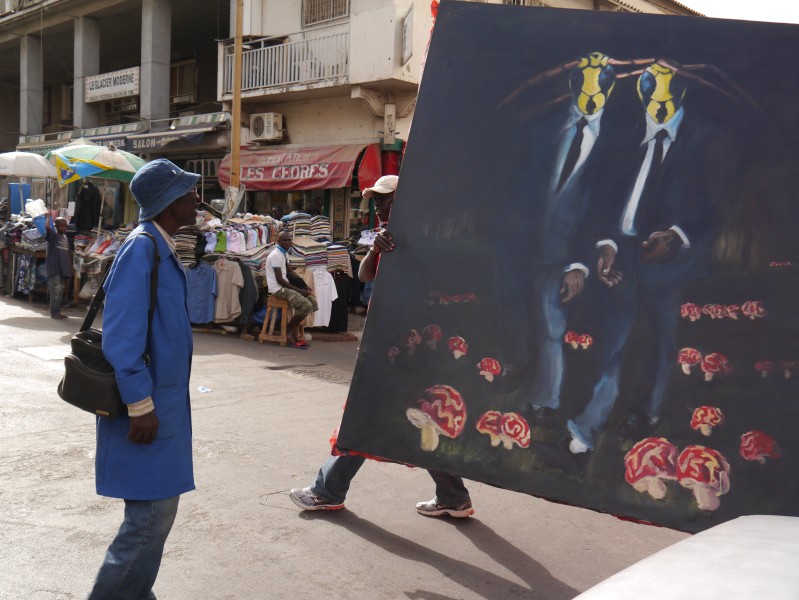 La pièce « Twin Freaks », une grande toile d’1m90 réalisée à Dakar, a été sortie par les agents et moi même pour explorer les coins improbables de la ville. De la Cathédrale au Magic Land, du Ministère des Finances au marché de Soumbédioune. Escortée par les agents d’accueil du Musée des Biens Communs, « Twin Freaks » propose un regard critique et ironique sur la fonction de médiation dans la création artistique contemporaine. Mais la promenade de la toile n’est pas encore arrivée à destination, elle sera offerte à la fin de l’exposition à un lieu public. Affaire à suivre…